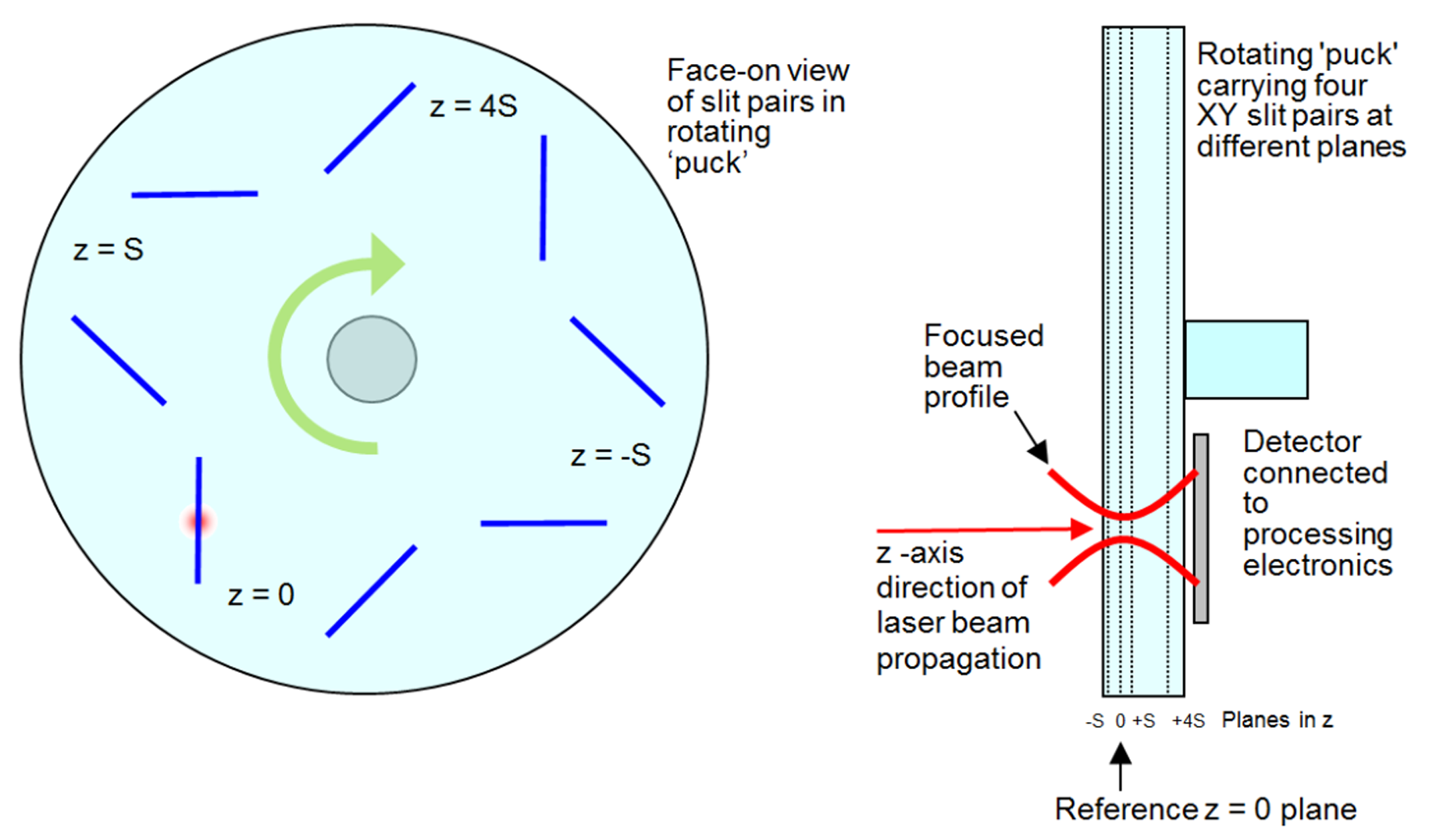 DataRay 的 BeamMap2 代表了一種完全不同的實時波束輪廓分析方法。它擴展了 Beam'R2 的測量功能,允許在光束行程的多個位置進行測量。這種實時掃描狹縫系統在旋轉圓盤上的多個 Z 平面上使用 XY 狹縫對,同時測量四個不同 Z 位置的四個光束輪廓。BeamMap2 的獨特設計在實時測量焦點位置、M2、光束發散度和指向方面有利。