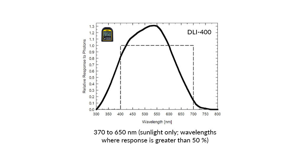 DLI-400 日光計是2022 年的新產品,用于抽查光合有效輻射(PAR;400–700 nm)水平并測量日光積分(DLI) 和光周期。DLI-400 是一種低成本選項,僅在陽光和某些寬帶光源下準確。PAR、DLI 和光周期影響植物的生長和發育,通常在溫室和生長室中測量它們以幫助進行光照管理和決策。DLI是指24小時內入射在一個平面上的PAR或擴展PAR(ePAR)的總量,單位為每天每平方米的摩爾數。光周期是 24 小時內 PAR 或 ePAR 入射的總時間,以小時 (h) 為單位表示。
