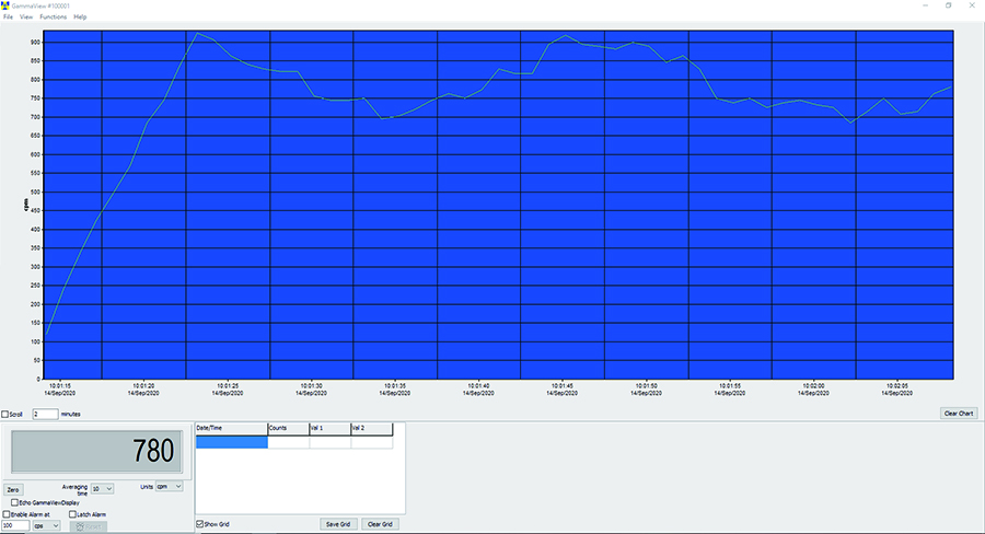 Observer USB軟件讀取Total Counts、CPM、μR/hr、mR/hr、CPS、μSv/hr,并能夠收集、記錄接收到的數(shù)據(jù)、設(shè)置校準(zhǔn)日期和設(shè)置,以及回顯PC上收集的讀數(shù)。數(shù)據(jù)顯示在圖形和數(shù)字屏幕儀表上。數(shù)據(jù)可以通過各種方式保存或打印,包括電子表格格式。可以為圖形上的每個(gè)點(diǎn)調(diào)整停留/計(jì)數(shù)時(shí)間,并且可以設(shè)置計(jì)數(shù)的時(shí)間長度。軟件顯示屏具有可調(diào)節(jié)的設(shè)置和可設(shè)置的警報(bào)。