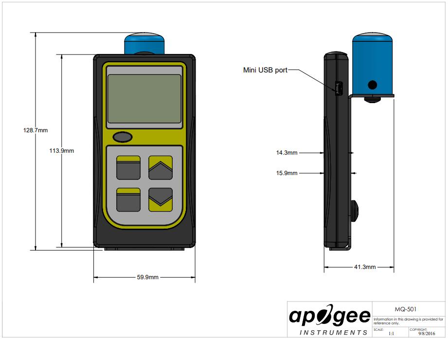 MQ-501 設計為易于使用的手持式儀表,用于抽查測量。該儀表包括 AM-001 儀表安裝支架,用于將傳感器安裝在儀表的水平面上,以及約 0.17 m 的電纜以容納支架長度。全光譜傳感器采用藍色增強型硅光電二極管和定制濾光片,具有堅固的自清潔傳感器外殼設計,陽極氧化鋁主體和丙烯酸漫射器。典型應用包括室外環境、溫室和生長室中植物冠層的 PPFD 測量,以及相同環境中的反射或冠層下(透射)PPFD 測量。