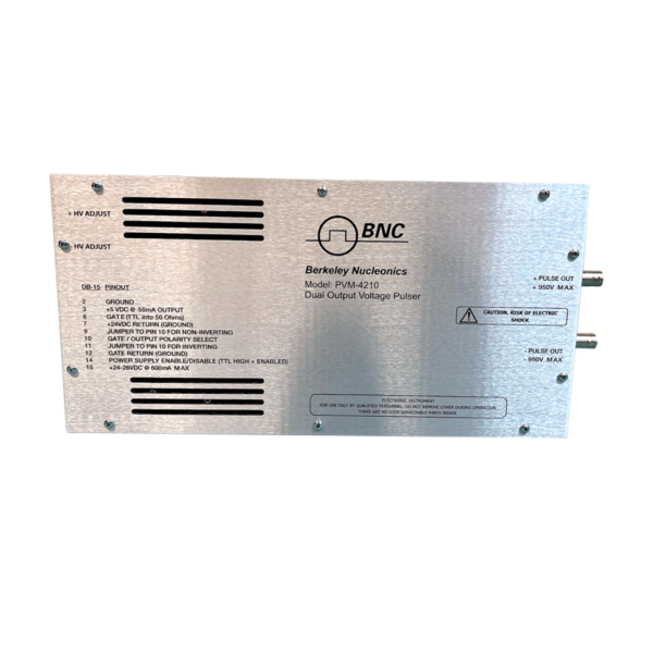 PVM-4210 脈沖發生器模塊提供兩個脈沖輸出通道,由通用控制邏輯控制。當控制邏輯接收到門信號時,兩個通道同時發出脈沖。一個通道從地脈沖到正高壓,另一個通道從地脈沖到負高壓。因此,每個輸出都可以連接到普克爾斯盒或 Q 開關的電極,或連接到一對偏轉板,從而在電池或板上提供 1,900 V 差分脈沖。