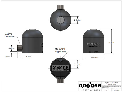 Apogee Instruments SP系列日冕計由鑄造丙烯酸擴散器(濾波器),光電二極管和信號組成 處理電路安裝在陽極氧化鋁外殼,和電纜連接傳感器到一個 測量設備。傳感器是盆栽固體,沒有內部空氣空間,是專為連續總 室外環境中平面上短波輻射的測量。SP系列傳感器輸出 與太陽總短波輻射成正比的模擬電壓。電壓信號來自 傳感器與入射在平面上的輻射成正比(不一定是水平的),其中 輻射從一個半球的各個角度發出。