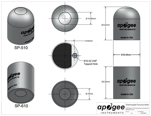 這些傳感器也可以與我們向下的日射強度計結合使用,形成反照率計。對于此應用,我們推薦 Apogee SP-710-SS反照率計傳感器套件,其中包括一個SP-510-SS向上的總輻射表、一個SP-610-SS向下的總輻射表、一個AY-001差分分離器,以及AW-605-SS 5 米電纜。 要安裝到桅桿或直接安裝到太陽能電池板,我們建議使用 AL-130 反照率計安裝支架或 AM-500 凈輻射計安裝支架,搭配 帶 12" 桿的AM-130安裝夾具。