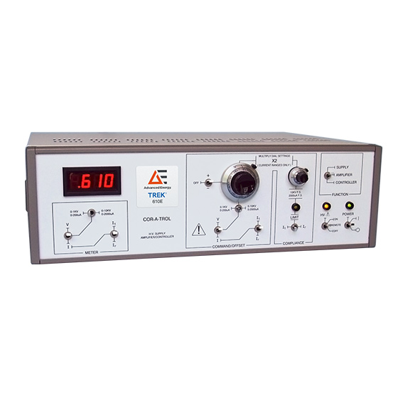 Trek 610E 提供六種高壓操作模式。作為高壓放大器,Trek 610E 通過 100 V/V 或 1000 V/V 的開關可選設置放大外部施加的信號。當用作跨導放大器時,外部施加的電壓信號產生成比例的輸出電流。作為高壓參考電源,Trek 610E 的前面板旋鈕控制輸出電壓,當用作電流電源時,同一個旋鈕控制輸出電流。控制器模式下的 Trek 610E 保持高壓放大器模式,但放大器輸入和反饋元件未固定,可供用戶配置。