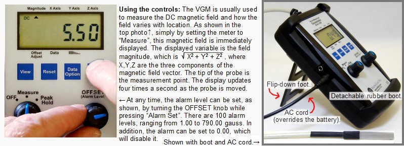 每個軸的精度在室溫下為讀數的 ±1% (16 C 至 29 C 或 61 F 至 84 F),以及 -4 C 至 65 C(25 F 至 149 F)整個溫度范圍內讀數的 ±2%。幅度精度相同。X、Y 和 Z 的偏移量在 23C 時預設在 ±0.1 高斯以內,溫度漂移 < 0.01 高斯/攝氏度。偏移量可以由用戶更改和/或恢復到預設水平,次數不限次。探頭具有 1/4 英寸正方形(6.35 x 6.35 毫米)橫截面,所有三個霍爾傳感器都在探頭末端1/8 英寸(3.2 毫米)范圍內。它位于不可拆卸的 40 英寸(100 厘米)柔性電纜的末端。所有三個軸的指向精度(XYZ 正交性)均優于 1 度弧度。隨附的標準 9 伏電池可持續約 10 小時的“開啟”時間(耗電 = 25 毫安)。LOW BATTERY 指示器會在電池壽命剩余約一小時時顯示。重量為 260 克(0. 6 磅)儀表尺寸為 14cm x 9cm x 4.5cm 厚(5.5″ x 3.5″ x 2.75″)。VGM 型號的保修期為一年。(在此期間,AlphaLab Inc. 將支付返回給我們的標準運費和退回給您的運費。保修時間將根據您未擁有儀表的時間延長。)包含校準證書。通常 10 年內不需要重新校準,但如果需要,我們可以對該儀表進行重新校準(收費)。