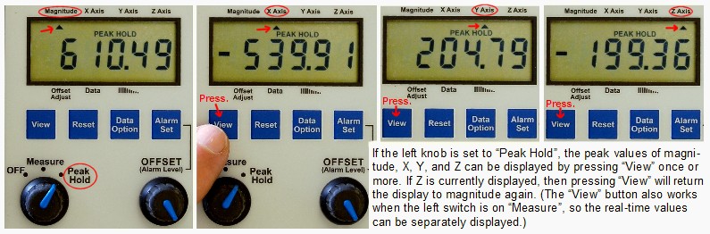 可用于長期峰值檢測。所有四個峰值都將保留存儲(并在遇到更高峰值時繼續更新),直到您重置它們。隨時顯示幅度、X、Y、Z的峰值和當前值。