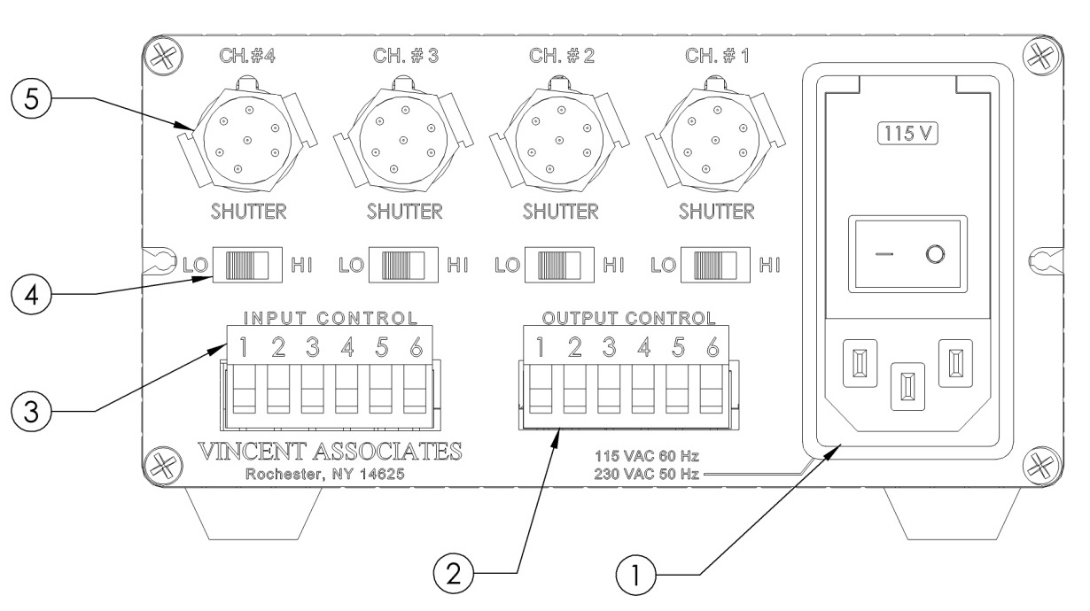 | 輸出控制 (2) | 提供來自每個快門通道的電子同步信號輸出。輸出指示快門電子同步的狀態(如果快門配備電子同步)。每個通道一個輸出。請參閱 VMM-D3/D4 用戶手冊第 15-19 頁中的接線板布局。低電平有效輸出。輸出端子 #5 – 當所有同步輸出變為低電平時為低電平有效。 |