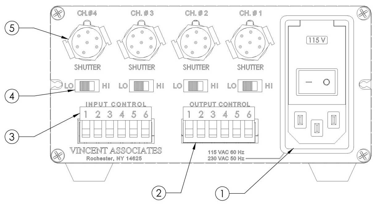 | 輸入控制 (3) | 為每個通道提供高電平有效控制。輸入 TTL 高 – 快門打開,輸入 TTL 低 – 快門關(guān)閉。端子 #5 – 有效高,輸入 TTL 高 – 所有快門打開,輸入 TTL 低 – 所有快門關(guān)閉。請參閱 VMM-D3/D4 用戶手冊第 15-19 頁中的端子排布局。 |