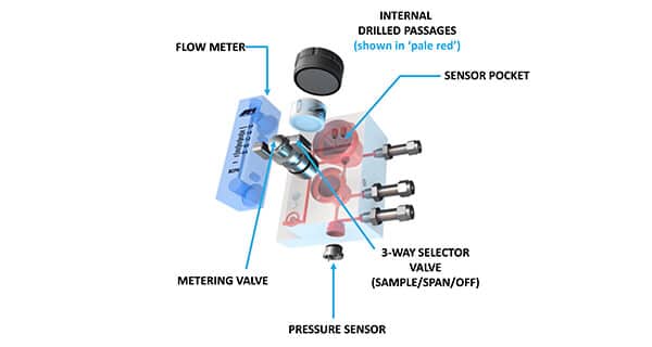 | ELIMINATOR CELL BLOCK | Contains a Complete Sample System with all components, including the flow meter, metering valve, pressure sensor and 3-way Selection (Sample/Span/Off) Valve, fully integrated |