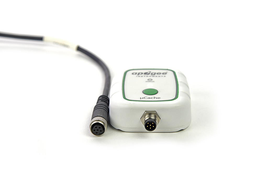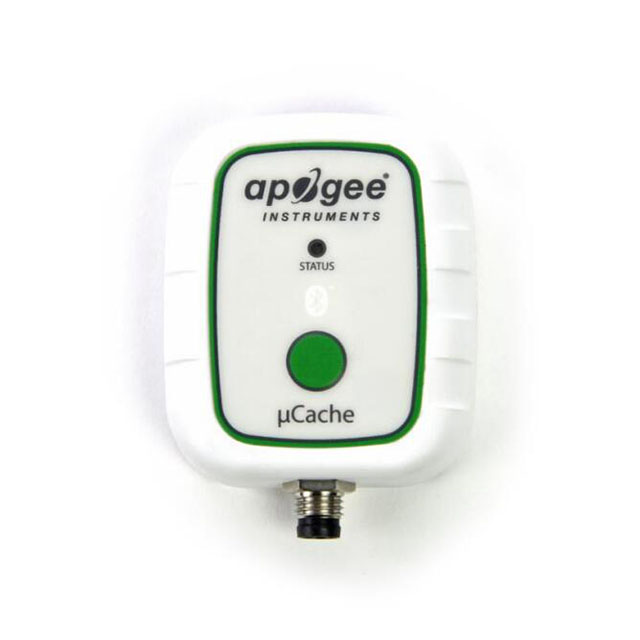 The new Apogee microCache (μCache) is a ruggedized, battery-powered, Bluetooth® Low Energy, single-sensor datalogging device that can be used with Apogee's SQ-110 Original Quantum, SQ-500 Full-spectrum Quantum, SQ-620 Extended Range PFD sensor, SQ-640 Quantum Light Pollution sensor, SP-700 Albedometer, S2-141 PAR-FAR sensor, S2-131 Red - Far-red sensor, SP-110 Silicon-cell Pyranometer, SP-510-SS and SP-610-SS Thermopile Pyranometers, SU-200 UV-A sensor, and the SI-100 Series of Infrared Radiometers.