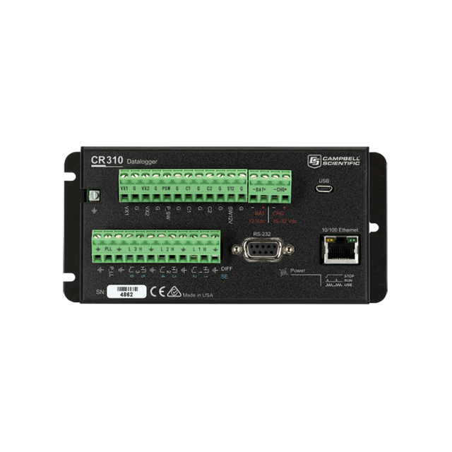 The CR310 is a multi-purpose, compact, low-cost measurement and control data logger that includes an integrated 10/100 Ethernet port and removable terminal connectors. This entry-level data logger, with its rich instruction set, can measure most hydrological, meteorological, environmental, and industrial sensors. It will concentrate data, making it available over varied networks and deliver it using your preferred protocol. The CR310 also performs automated on-site or remote decision making for control and M2M communications. The CR310 is ideal for small applications requiring long-term, remote monitoring and control.