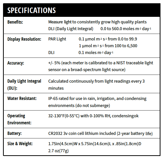 DLI mode shows Daily Light Integral on the LCD (no computer needed).
