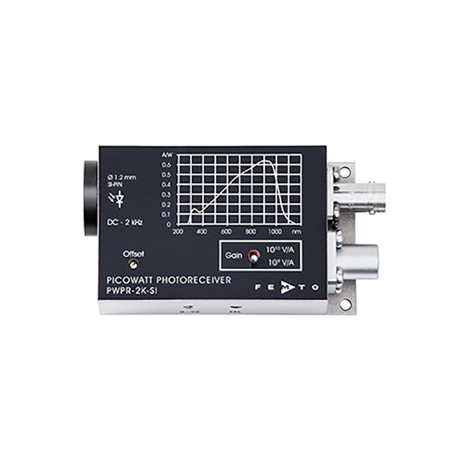 In addition to precise and fast cw-measurements the relatively large bandwidth from DC to 2 kHz also allows time-resolved and modulated measurements. Particularly the combination with lock-in amplifiers results in ultra-sensitive measurement systems being almost immune to disturbances from external sources. In this way the PWPR-2K can easily detect optical powers from about 100 fW up to 10 nW.