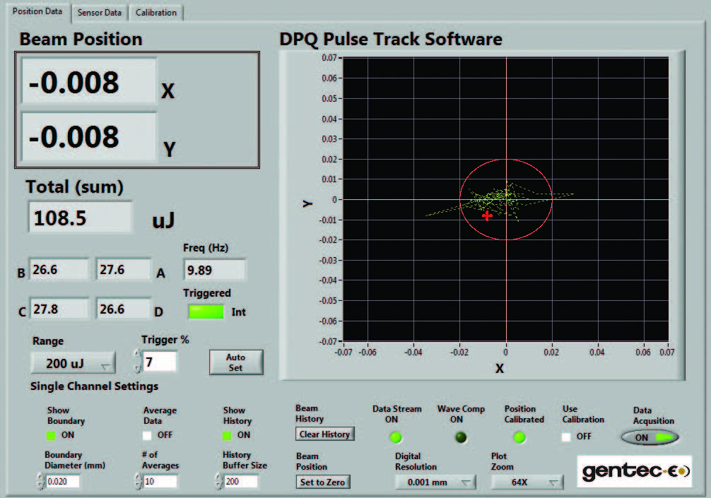 QUAD-4TRACK includes powerful, stand alone, LabView software which is used to control the instrument, process the data, and display X and Y position. It also displays the energy or power of your source and repetition rate. The large graphic in this screen shows the position of the centroid of the beam and tracks its movement in real time. The software includes many handy features like: set boundary, zoom (2X to 128X), set resolution, data logging, and many more. The green line represents the tracking history.