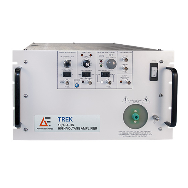 The non-inverting Trek 10/40A-HS is equipped with a four-quadrant, active output that sinks or sources the current into reactive or resistive loads throughout the output voltage range. This type of output is essential to achieve accurate output responses and high slew rates demanded by highly capacitive or reactive loads. The Trek 10/40A-HS is optimal for electrophoresis, electro-optic modulation, material poling, and numerous other applications.